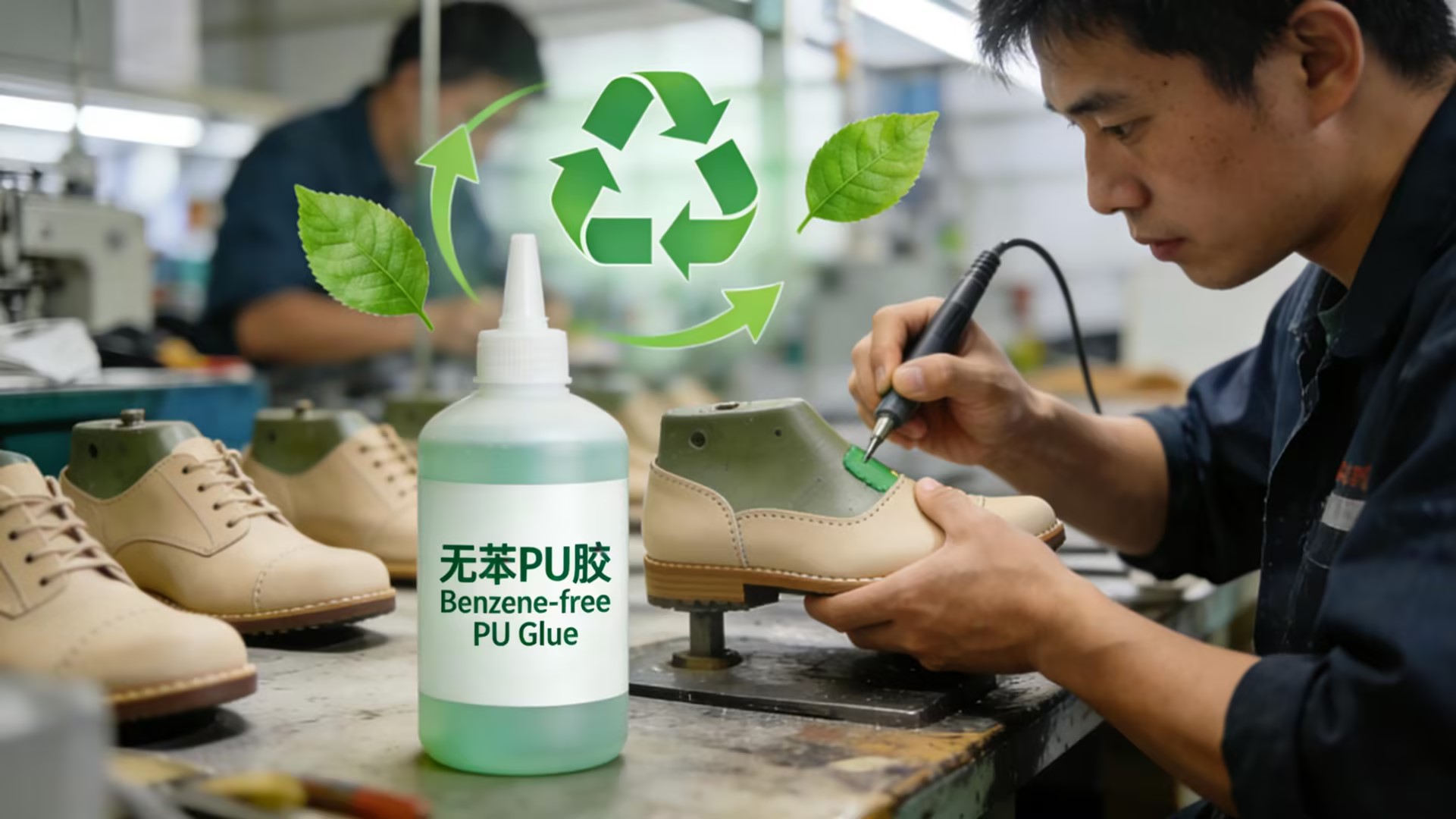 Benzene-free PU adhesive refers to a polyurethane adhesive that does not contain toxic aromatic hydrocarbon solvents such as benzene, toluene, or xylene during its preparation and application. It typically uses environmentally friendly solvents or water as the medium, allowing workers to avoid exposure to the pungent odor of benzene-based compounds during production. Additionally, consumers are protected from residual benzene-based solvents in finished footwear, thereby fundamentally eliminating the health hazards posed by benzene-based substances to humans and their pollution to the environment.